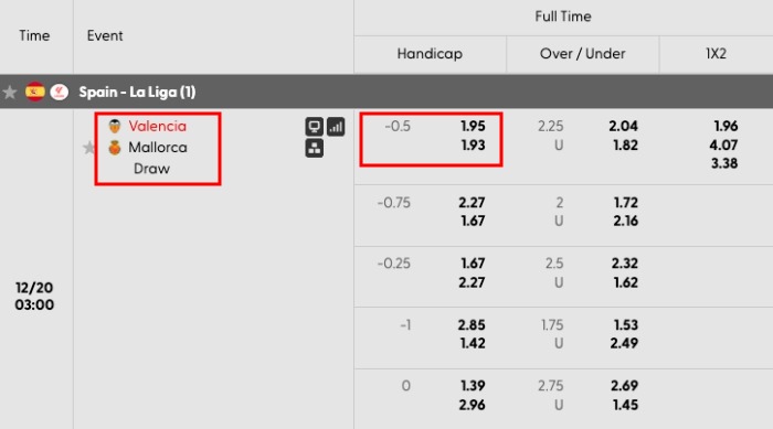 - If you bet $10,000 on Valencia and they win by at least 1 goal difference, → You receive the full payout at odds of 1.95 ($10,000 * 1.95) = $19,500. This is your profit.